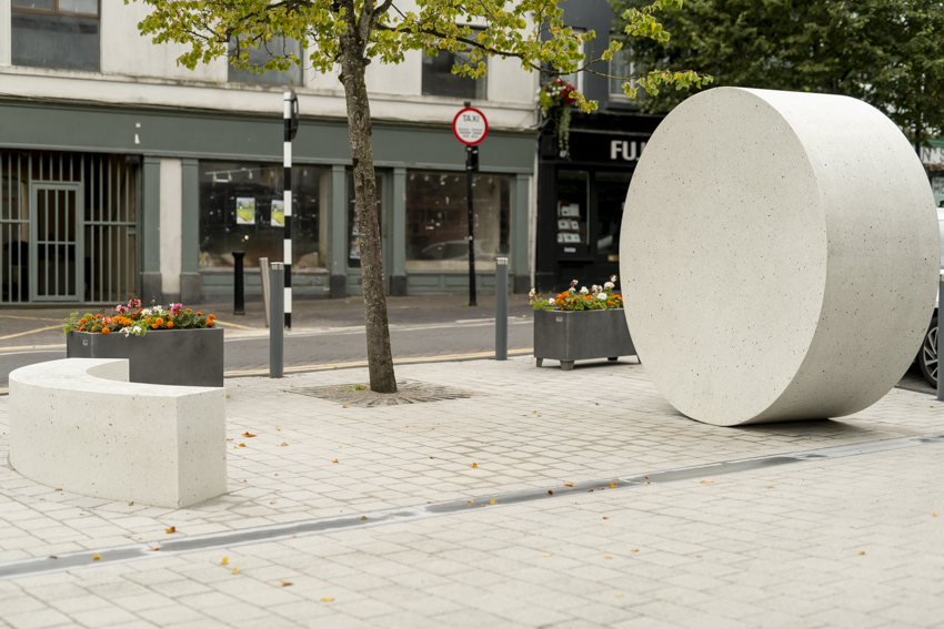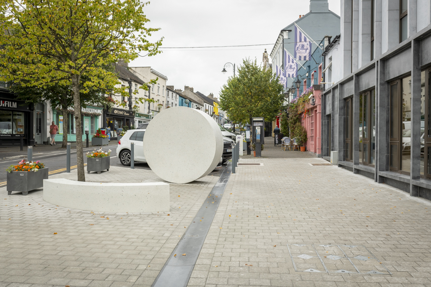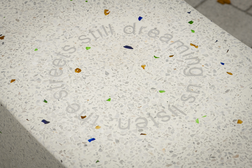The curved bench includes an inscription from Laois born writer Pat Boran ‘listen: the streets still dreaming us’ that further extends this invitation to listen.